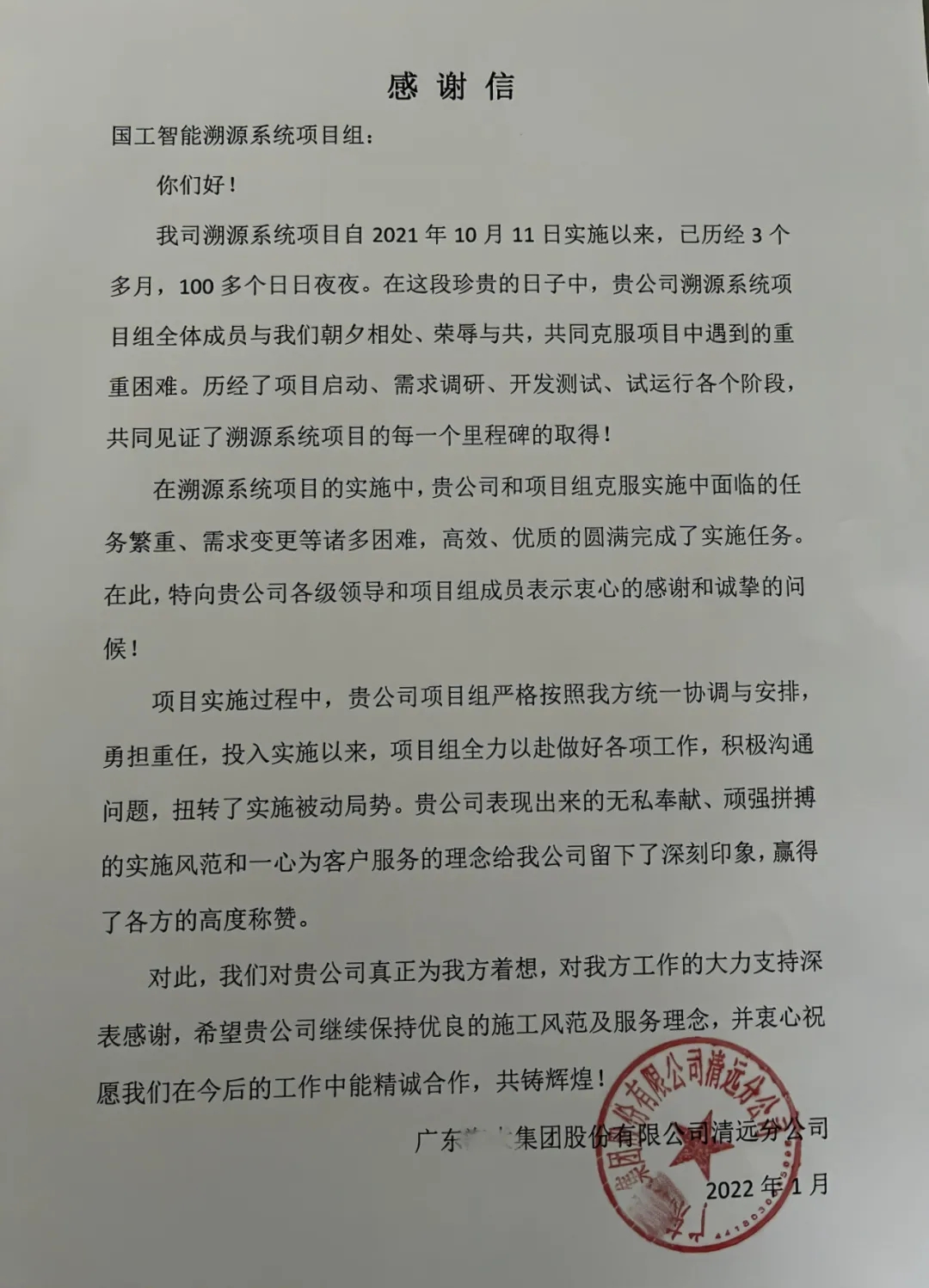 在溯源系統項目的實施中,此項目實施團隊克服實施中面臨的任務繁重、需求變更等諸多困難,高效、優質的圓滿完成了實施任務。因此,客戶為表達對國工智能項目實施團隊高效和專業的服務的認可,特別發送表揚信到公司,以示感謝和鼓勵。
