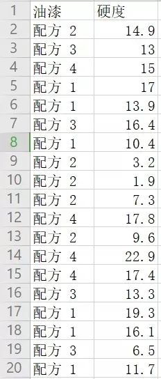某化學(xué)工程師想要比較四種油漆混料的硬度。每種油漆混料取六份樣品涂到一小塊金屬上,待金屬塊凝固后再測量每種樣品的硬度。為了檢驗均值是否相等,并評估均值對之間的差分,分析師配合使用單因子方差分析和多重比較。所以該化學(xué)工程師通過對影響質(zhì)量的因素方面的數(shù)據(jù)統(tǒng)計,得出了下列數(shù)據(jù)集合(部分):