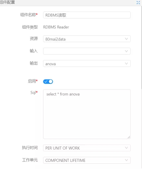 首先,我們需要在數(shù)據(jù)大腦系統(tǒng)中進行流程的搭建,思路是從數(shù)據(jù)庫中讀取數(shù)據(jù)后,將數(shù)據(jù)投入到單因素方差分析組件中,然后對算法運行所需要配置的參數(shù)進行配置,下圖是對數(shù)據(jù)庫讀取組件的配置: