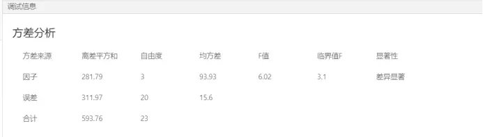 我們可以得到的結(jié)論是油漆混料的硬度明顯不同。據(jù)此得出的結(jié)論是油漆的配方對油漆混料后的硬度有顯著影響,因為單因素方差分析只針對一個因素,所以得出的結(jié)果有限,等我們拿到這個數(shù)據(jù)之后可以在數(shù)據(jù)大腦平臺中進行更進一步的分析,從而可以分析配方的具體哪幾種因素對硬度影響較大。