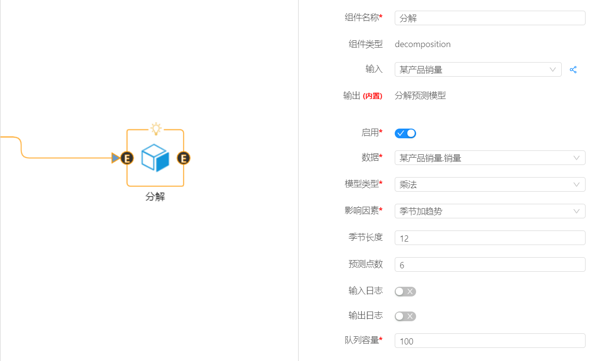 使用系統(tǒng)已集成好算法的分解組件,進(jìn)行數(shù)據(jù)的時間序列預(yù)測分析處理。對組件參數(shù)進(jìn)行設(shè)置,模型類型配置為乘法模型;影響因素配置為季節(jié)加趨勢;季節(jié)長度配置為12;預(yù)測點數(shù)配置為6;隊列容量設(shè)為100。單擊運(yùn)行,從調(diào)試界面查看運(yùn)行結(jié)果。