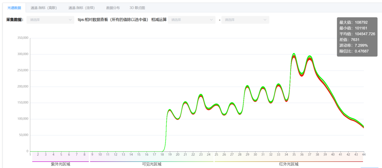 軟件系統(tǒng)通過對含水量錄入的標(biāo)定值與光譜強度進行綜合分析,會得出噪信比圖以及相關(guān)性圖。其中噪信比圖表示每個波長通道上光譜數(shù)據(jù)噪聲與有效信息的比值,在實際應(yīng)用中,此值越小越好。相關(guān)性圖表示所有樣品,在每個波長通道上吸收強度與指標(biāo)標(biāo)定值的線性或者非線性關(guān)系是否良好,直接反應(yīng)出其檢測的可行性,在實際應(yīng)用中,此值越大越好。