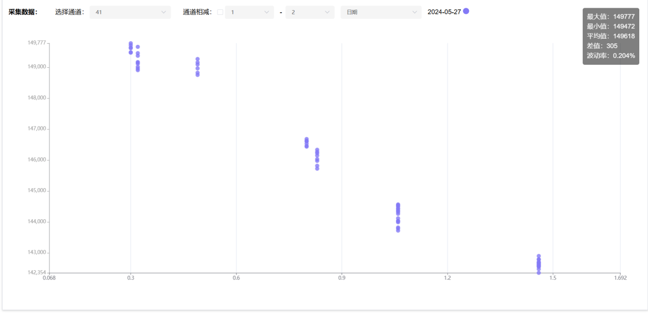 由上圖可知,含水量在1500nm波段有明顯的相關(guān)性,相關(guān)性高達0.95,且躁信比較低,為0.82。通過檢查該波段的落點圖,發(fā)現(xiàn)有較好的線性關(guān)系,落點圖如下圖所示: