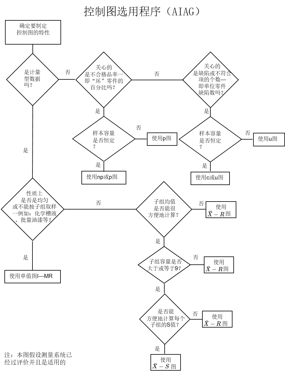 當我們需要建立控制圖來監控質量異常時,我們需要根據質量特性來進行選擇,圖2是《Statistical Process Control, reference manual, AIAG》給出的控制圖選用程序,非常清晰地指明了如何通過質量特性來選擇控制圖,這里需要說明一點是,在化工企業里面,由于某些產品性質均勻,所以采用I-MR單值圖的情況會較多。