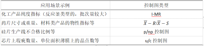 在工業現場,控制圖的應用場景非常之多,表1針對各種類型的控制圖列舉了一些應用場景以供參考: