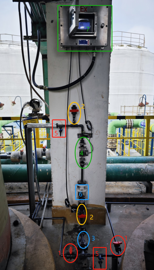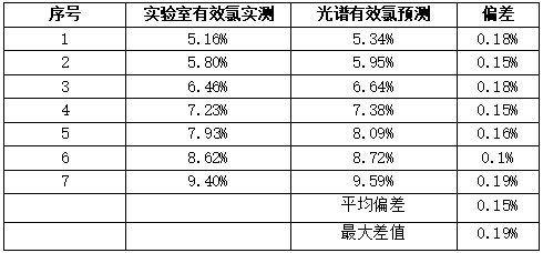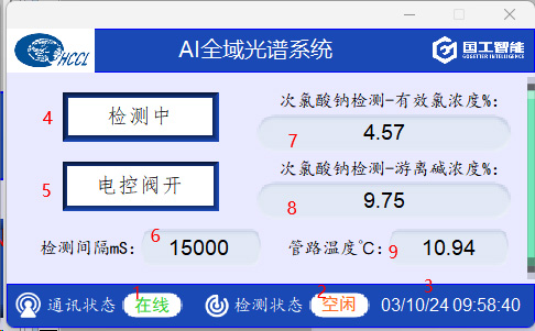 圖中圈1的地方為手動(dòng)閥,當(dāng)打開其中一個(gè)手動(dòng)閥,物料即流經(jīng)管道,接著打開電磁閥(圈2)物料先經(jīng)過Y型過濾器(圈3),再經(jīng)過視盅(圈6),然后充滿光譜儀(圈4)一直流經(jīng)至取樣口(圈5),打開取樣口進(jìn)行取樣送檢,同時(shí)光譜儀開始檢測(cè),當(dāng)實(shí)驗(yàn)室檢測(cè)結(jié)果出來后,我們將同批次光譜檢測(cè)的物料有效氯的含量參數(shù)和游離堿的含量參數(shù)進(jìn)行標(biāo)定,以此類推,進(jìn)行大量取樣檢測(cè)標(biāo)定過程。檢測(cè)結(jié)果在光譜控制柜(圈7)上直接顯示。