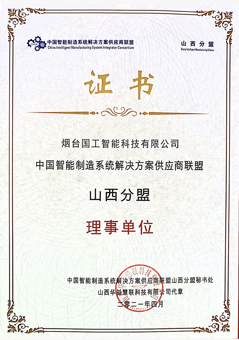 (中國智能制造系統解決方案供應商聯盟山西分盟理事單位證書)