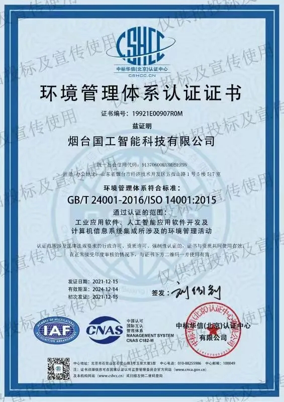 2021年12月中旬,煙臺(tái)國(guó)工智能科技有限公司正式獲得ISO 14001環(huán)境管理體系認(rèn)證證書(shū)、ISO 9001質(zhì)量管理體系認(rèn)證證書(shū)以及ISO 45001職業(yè)健康安全管理體系認(rèn)證證書(shū)。同期獲得了軟件能力成熟度模型集成(CMMI:Capability Maturity Model Integration)三級(jí)認(rèn)證證書(shū)。標(biāo)志著國(guó)工智能在智能制造行業(yè)的規(guī)范化和標(biāo)準(zhǔn)化管理達(dá)到新的水平。