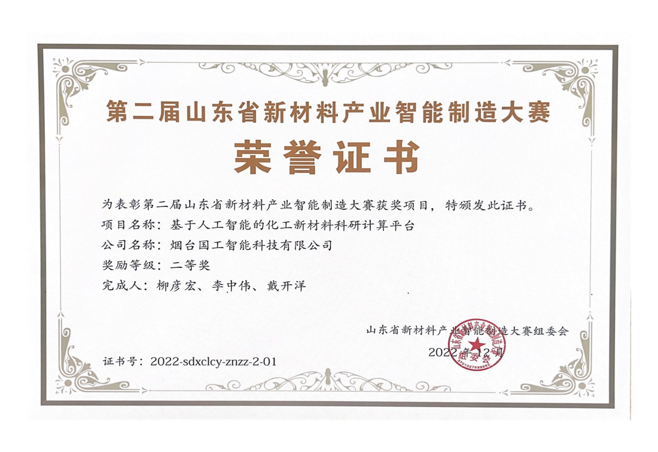 為深入貫徹落實省委省政府關于加快推進新舊動能轉換重大工程戰略部署,進一步支持新材料產業智能制造創新發展,2022年12月29日,在山東省工業和信息化廳、山東省總工會的指導下,山東省新材料產業協會聯合山東省冶金工會委員會、山東大學在濟南舉辦了第二屆山東省新材料產業智能制造大賽決賽。2023年2月21日,山東省工業和信息化廳、山東省總工會發布了《關于公布第二屆山東省新材料產業智能制造大賽獲獎名單通知》,煙臺國工智能科技有限公司《基于人工智能的化工新材料科研計算平臺》項目榮獲大賽二等獎。